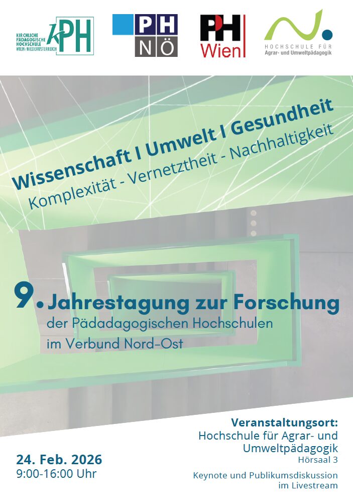 Alle Mitarbeiter:innen der Pädagogischen Hochschulen im Verbund Nord-Ost sind eingeladen, an der 9. Jahrestagung zur Forschung an der Hochschule für Agrar- und Umweltpädagogik teilzunehmen. Im Fokus der Veranstaltung stehen theoretische und/oder empirische Gestaltung, Analyse und Evaluation von Lehr-Lernprozessen im Kontext der aktuellen Themen‑Trias Wissenschaft | Umwelt | Gesundheit. Außerdem besteht die Möglichkeit, die Keynote und die abschließende Diskussion im Livestream zu verfolgen.